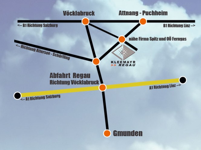 Sie erreichen uns am besten über die A1 Abfahrt Regau. Nach dem Sie die Autobahn verlassen haben, folgen Sie den Beschilderungen in Richtung Vöcklabruck. Auf der ersten großen Kreuzung mit Ampelanlage (Himmelreichkreuzung) biegen Sie rechts Richtung Attnang -